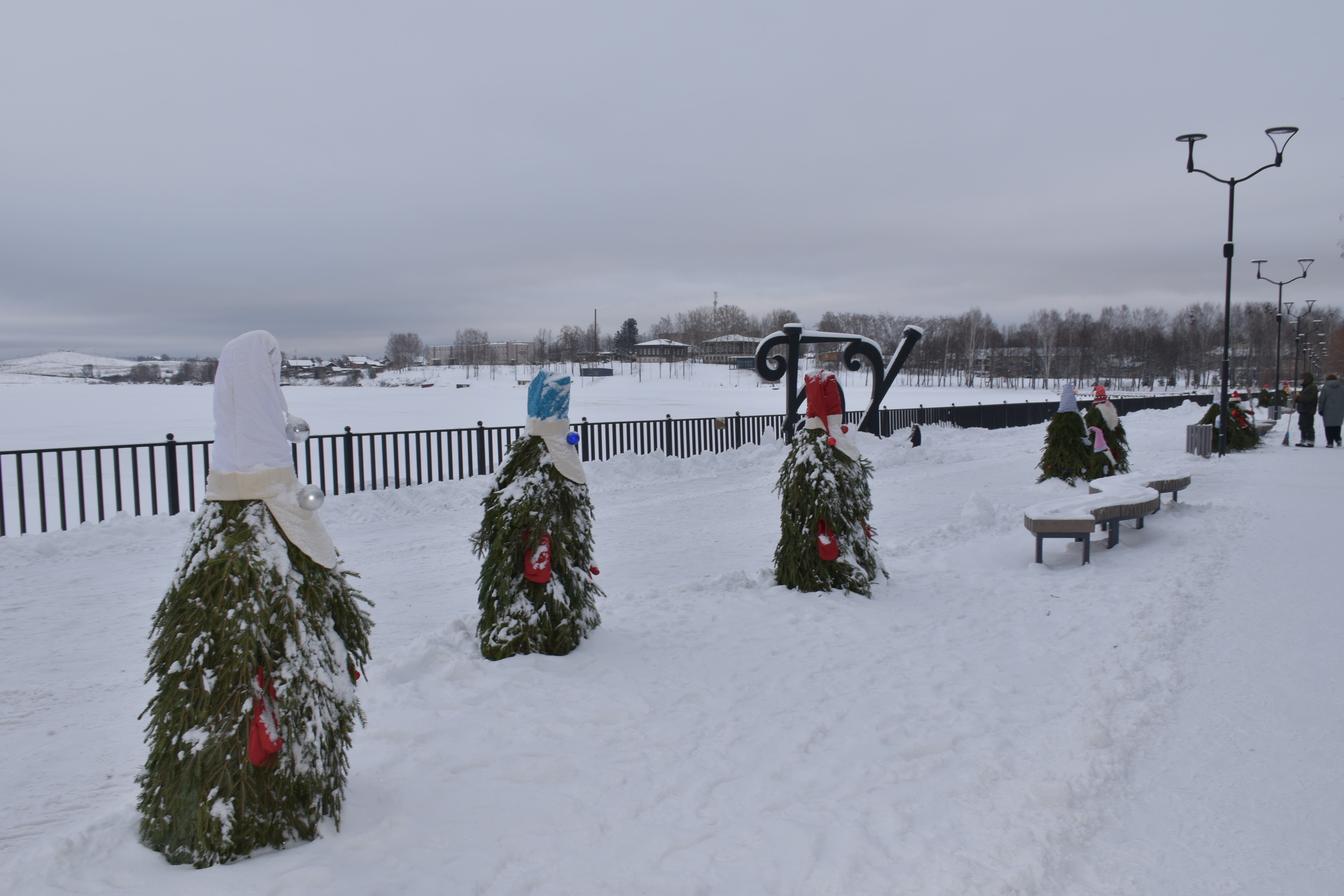 Накануне Нового года городскую набережную украсили забавные гномики-лесовички, выполненные из еловых веток.