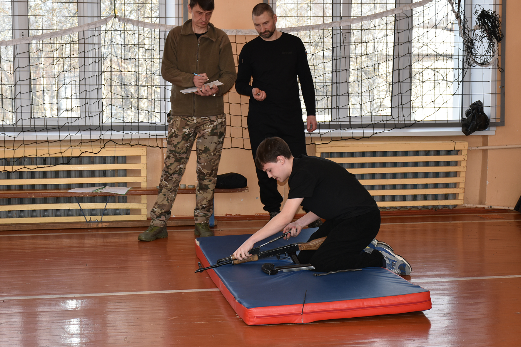 В Государственной школе состоялись индивидуальные испытания: для командиров (работа с топографическими картами), инженеров-саперов (поиск «мин» в снегу), связистов (определение знаков азбуки Морзе), медиков, штурмовиков (стрельба и «прикрытие»), операторов БПЛА (выполнение заданий онлайн) и военкоров (написание статей на заданную тему), а также огневая подготовка (сборка автомата Калашникова, загрузка патронов в винтовку и стрельба по мишеням). То есть впервые каждый участник сыграл определенную роль в борьбе за честь коллектива!